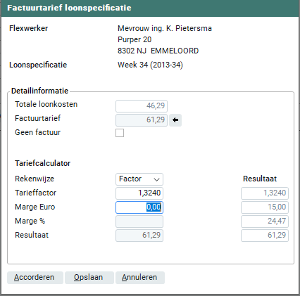 In het onderdeel 'Detailinformatie' worden de totale loonkosten getoond. Je kunt in het veld 'factuurtarief' handmatig het factuurtarief vastleggen. Je kunt ook gebruik maken van de tariefcalculator. In de kolom 'Resultaten' zie je de berekende resultaten naar aanleiding van alle ingegeven gegevens.