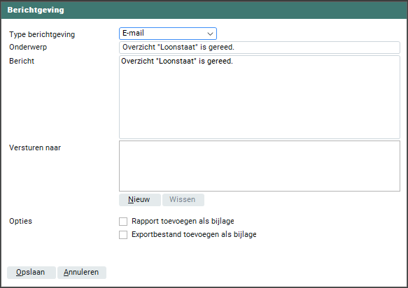 Door het activeren van de knop 'Nieuw' kun je aan elk onderdeel één of meerdere berichtgevingen koppelen. Met de knop 'Wijzigen' kun je een berichtgeving die reeds is aangemaakt wijzigen. Je kunt het onderwerp, bericht en de ontvanger(s) aanpassen. Alleen het 'Type berichtgeving' kunt je niet aanpassen. Wanneer je een reeds bestaande berichtgeving wilt verwijderen activeer je de knop 'Verwijderen'.