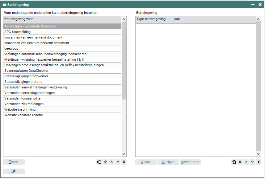 In het onderdeel 'Beheer > Berichtgeving' kun je berichtgevingen instellen voor processen die door Easyflex worden aangemaakt. Denk hierbij aan onder andere arbeidsongeschiktheidsmeldingen, statuswijzigingen en verzonden loonaangiften. Ook voor het ontvangen van een inschrijving via jouw website of voor een vacaturereactie kun je berichtgevingen instellen, zodat je geen enkele inschrijving mist.