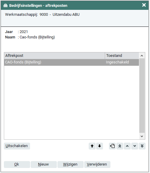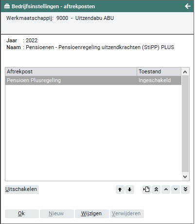 Wanneer je de knop 'Onderhoud' activeert, verschijnt op het scherm de naam en de toestand van de pensioenregeling. De toestand van de pensioenregeling kan ingeschakeld of uitgeschakeld zijn en dit kun je wijzigen door het activeren van de knop 'Inschakelen' (wanneer de huidige toestand 'Uitgeschakeld' is). Wanneer een aftrekpost uitgeschakeld is, kan deze niet worden geselecteerd in het tabblad 'Fiscaal-sociaal' bij de flexwerker.