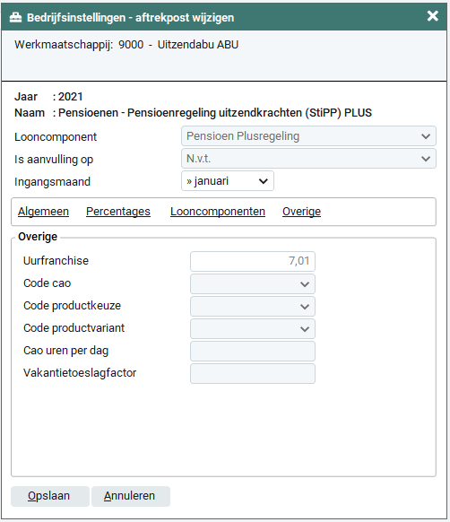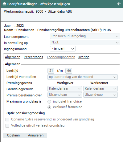 Voor het inrichten van de Algemene pensioenregeling kun je voor informatie over de instellingen bij de Pensioenregeling uitzendkrachten (StiPP) en Pensioenregeling uitzendkrachten (StiPP) PLUS raadplegen. Enige afwijkende hierin is dat de tab 'Overige' voor de Algemene pensioenregeling niet beschikbaar is.