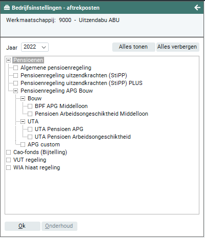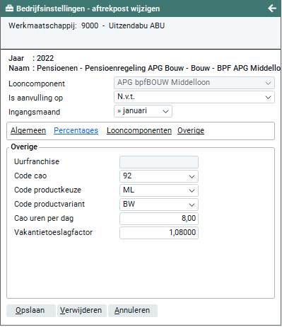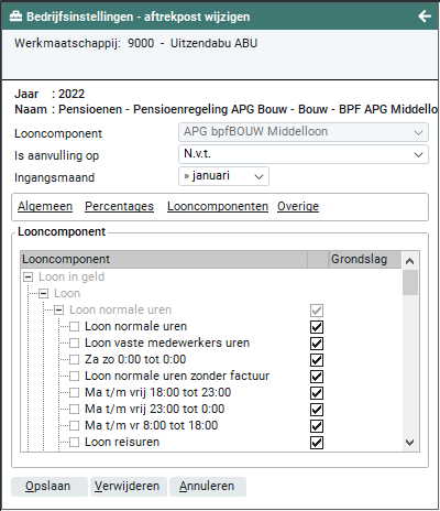 Vanaf versie 2022-01 staan de APG-aftrekposten direct onder Pensioenregeling APG Bouw. Onder 'Bouw' staan de componenten die behoren tot cao code 92 en onder UTA staan de componenten die behoren tot cao code 17. Alle andere APG pensioenfondsen die zijn vastgelegd, staan bij APG Custom. Laatstgenoemde dient nog wel te worden geopend om de andere APG-componenten te zien.