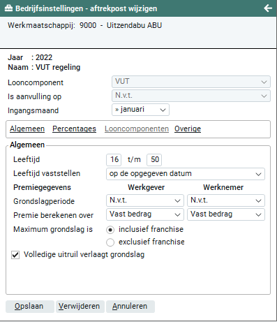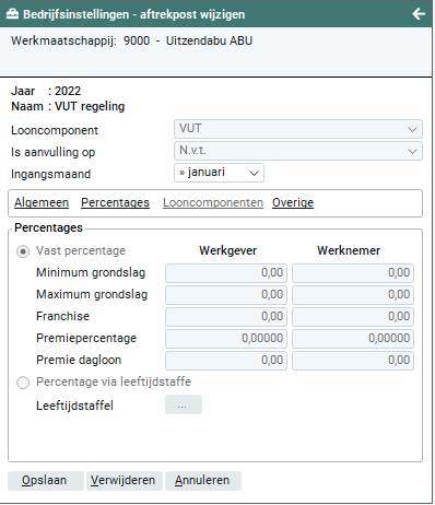 Als de VUT regeling wordt vastgesteld op basis van vaste percentages dien je in deze rubriek de gegevens vast te leggen. Deze gegevens dien je in te geven voor werkgever (werkmaatschappij) en werknemer (flexwerker).