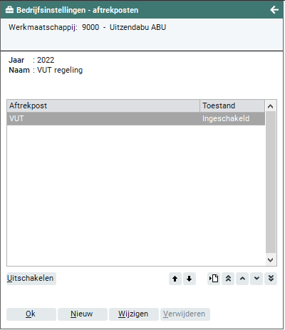 De toestand van de VUT-regeling kan ingeschakeld of uitgeschakeld zijn en kun je wijzigen door het activeren van de knop 'Inschakelen' (wanneer de huidige toestand 'Uitgeschakeld' is) of door het activeren van de knop 'Uitschakelen' (wanneer de huidige toestand 'Ingeschakeld' is). Wanneer een aftrekpost ingeschakeld is, kan deze worden geselecteerd bij een flexwerker (Frontoffice > Flexwerker > Fiscaal en sociaal). Wanneer een aftrekpost uitgeschakeld is, kan deze niet worden geselecteerd. Door het activeren van de knoppen 'Nieuw", 'Wijzigen' en 'Verwijderen' kun je VUT-regelingen toevoegen, wijzigen of verwijderen. Nieuwe of gewijzigde gegevens worden pas opgeslagen nadat de knop 'Opslaan' is geactiveerd. Indien je kiest voor het verwijderen van gegevens worden de te verwijderen gegevens eerst op het scherm getoond. Pas na het activeren van de knop 'Verwijderen' worden de gegevens daadwerkelijk verwijderd. Wanneer de VUT regeling welke je wilt verwijderen in gebruik is, bijvoorbeeld wanneer er flexwerkers gebruik maken van deze VUT regeling, is verwijderen niet mogelijk.