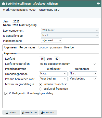 De WIA-hiaat geldt voor flexwerkers of medewerkers binnen een bepaalde leeftijdsgroep. Deze leeftijden dien je in dit veld in te geven. De minimum leeftijd is 15 jaar en de maximum leeftijd is 64 jaar.