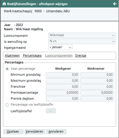 Als de WIA-hiaat regeling wordt vastgesteld op basis van vaste percentages dien je in deze rubriek de gegevens vast te leggen. Deze gegevens dien je in te geven voor Werkgever (werkmaatschappij) en Werknemer (flexwerker).