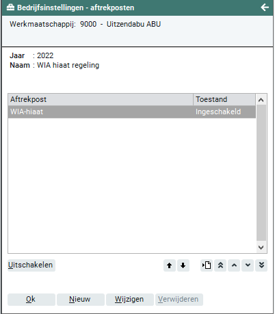 Wanneer je de knop 'Onderhoud' activeert, verschijnt op het scherm een overzicht van alle vastgelegde WIA-hiaat regelingen en de toestand van de regeling. De toestand van de WIA-hiaat regeling kan ingeschakeld of uitgeschakeld zijn en kun je wijzigen door het activeren van de knop 'Inschakelen' (wanneer de huidige toestand 'Uitgeschakeld' is) of door het activeren van de knop 'Uitschakelen' (wanneer de huidige toestand 'Ingeschakeld' is). Wanneer een aftrekpost ingeschakeld is, kan deze worden geselecteerd bij een flexwerker (Frontoffice > Flexwerker > Fiscaal en sociaal). Wanneer een aftrekpost uitgeschakeld is, kan deze niet worden geselecteerd.