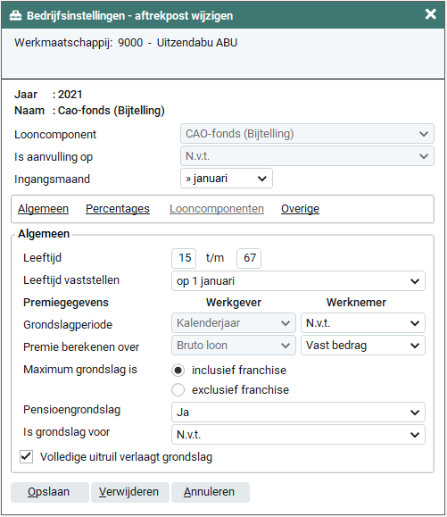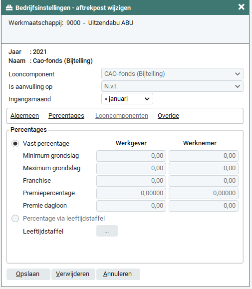 Voor het CAO-fonds kun je alleen gebruik maken van de vaste percentages en de optie ‘Leeftijdsstaffel’ niet beschikbaar.