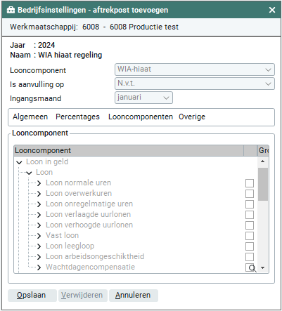 Je dient handmatig in het tabblad 'Looncomponenten' de looncomponenten te selecteren waarover de WIA premie dient te worden berekend.