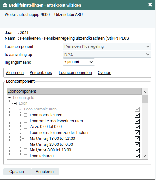 In dit tabblad kun je zelf bepalen welke looncomponenten wel of niet meetellen voor de pensioengrondslag van StiPP. De standaard instelling is conform het StiPP reglement. Je hebt de keuze uit alle looncomponenten welke zijn aangemaakt onder 'Loon in geld' en Loon niet in geld' in 'Beheer > Bedrijfsinstellingen > Looncomponenten'.