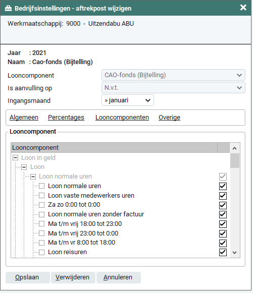 Dit tabblad is alleen beschikbaar als er in het tabblad 'Algemeen' bij het veld 'Premie berekenen over' is gekozen voor 'Handmatig kiezen'. In dit tabblad dien je aan te geven over welke looncomponenten het CAO-fonds dient te worden berekend. Je hebt de keuze uit alle looncomponenten welke zijn aangemaakt onder 'Loon in geld' en Loon niet in geld' in 'Beheer > Bedrijfsinstellingen > looncomponenten'.