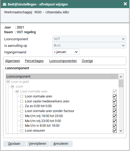 Je dient handmatig in het tabblad 'Looncomponenten' de looncomponenten te selecteren waarover de VUT premie dient te worden berekend.