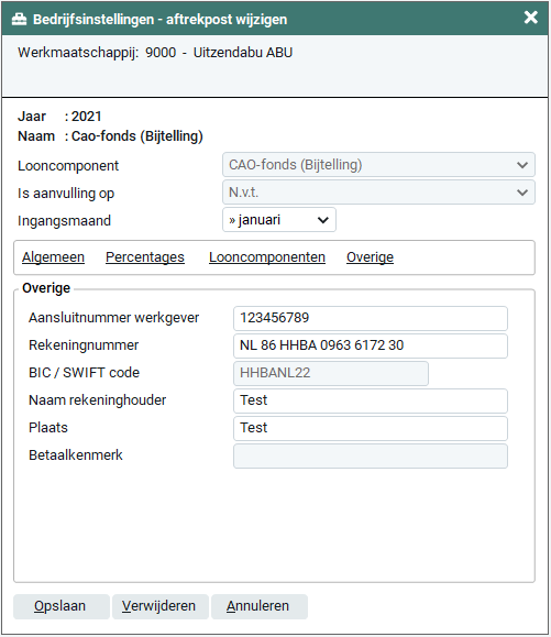 Voor het CAO-fonds kun je alleen gebruik maken van de vaste percentages en deze kun je alleen voor de werknemer invoeren. De in te voeren gegevens dien je ontvangen van het fonds welke je gaat gebruiken.