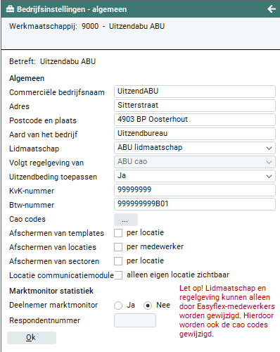 Aan de hand van deze instelling stuurt Easyflex de processen aan die betrekking hebben op de regelgeving. Deze instelling kan niet meer worden gewijzigd zodra je de OK knop op dit tabblad hebt geactiveerd. Wanneer deze instelling om welke reden dan ook moet worden aangepast, dien je hiervoor contact op te nemen met je accountmanager bij Easyflex. Het wijzigen van deze instelling heeft namelijk gevolgen voor o.a. alle lopende arbeidsovereenkomsten, plaatsingen en indeling van flexwerkers in bijvoorbeeld het fasensysteem.