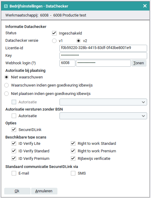 Dit is een automatisch gegenereerde combinatie van werkmaatschappijnummer en een wachtwoord. Dit wachtwoord moet in het dashboard van Datachecker ingericht worden. Dat kan via ‘Accountinstellingen’ > ‘Basic authentication voor resultaat webhook’. Hier dien je deze aan te zetten en de gebruikersnaam en het wachtwoord over te nemen wat bij bedrijfsinstellingen getoond wordt.