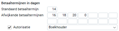 In dit veld kun je, indien gewenst, afwijkende betaaltermijnen invoeren. Wanneer je aan deze afwijkende betaaltermijn geen autorisatie koppelt, kan elke medewerker per relatie een keuze maken uit de standaard betaaltermijn of de afwijkende betaaltermijnen.