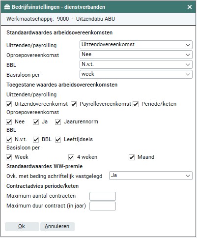 Middels de vinkjes in de checkboxen bepaal je welke opties er überhaupt gebruikt mogen worden in de arbeidsovereenkomsten in jouw werkmaatschappij (let op! De instelling is dus niet van invloed op de oproepinstelling op het tabblad 'Werk en personeel' in de plaatsing). Maak je bijvoorbeeld alleen maar gebruik van oproepovereenkomsten dan zou je de opties 'Nee' en 'Jaarurennorm' uit kunnen vinken, zodat deze niet per ongeluk gekozen kunnen worden in de Frontoffice. Let op! Een waarde die is vastgelegd als 'Standaard waarde' dient ook altijd aangevinkt te zijn.