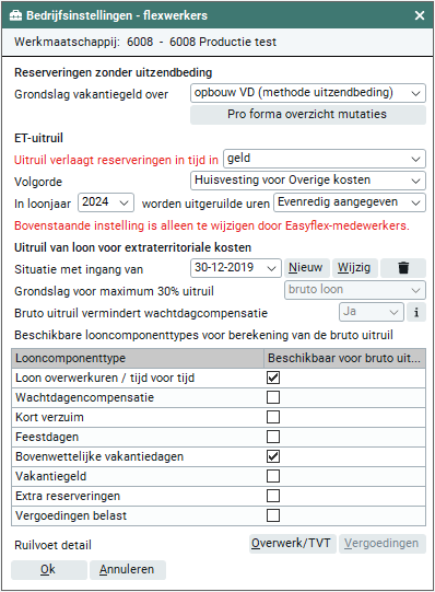 Let op! In de verloning wordt de ET-uitruil berekend per looncomponenttype. Dit betekent concreet dat als er overwerkuren worden verloond met een percentage lager dan 108% en in hetzelfde tijdvak ook overwerkuren met een percentage hoger dan 108%, dan worden deze componenten met elkaar gecompenseerd. - De 'Ruilvoet basis' is het verschil tussen het loon van de flexwerker (uurloon uit de plaatsing) en het WML voor de flexwerker.