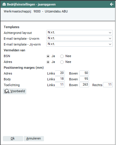 Nadat je de marges heeft ingesteld kun je met de knop 'Voorbeeld' een voorbeeld van een jaaropgave genereren met de ingestelde achtergrond lay-out en marges.