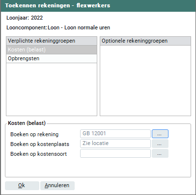 Afhankelijk van het soort looncomponent verschijnen één of meerdere verplichte rekeninggroepen. De mogelijkheden kunnen zijn: