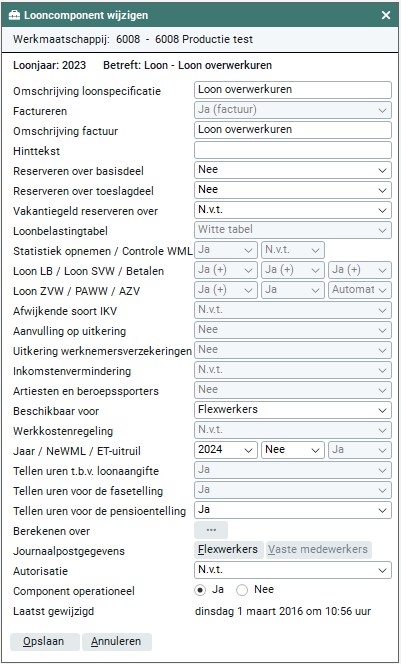 Je dient aan te geven of het looncomponent operationeel is of niet. Wanneer je kiest voor operationeel 'Ja' wordt het looncomponent beschikbaar gesteld binnen 'Frontoffice'. Wanneer je kiest voor operationeel 'Nee', wordt het looncomponent niet beschikbaar gesteld binnen 'Frontoffice'. Bij bepaalde looncomponenten kun je deze keuze niet wijzigen, standaard staat het looncomponent op 'Operationeel'.