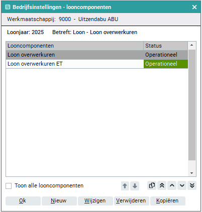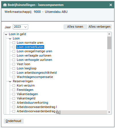 Wanneer je de knop 'Onderhoud' selecteert, toont Easyflex je standaard het aantal operationele looncomponenten dat al is aangemaakt. Met het aanvinken van de checkbox 'Toon alle looncomponenten' worden ook de niet-operationele looncomponenten.