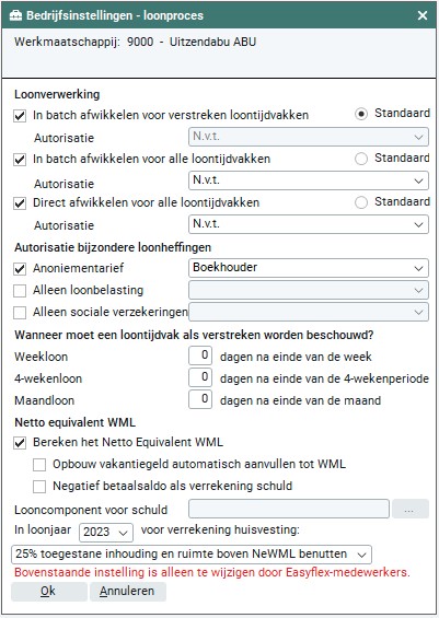 Deze instelling is altijd aan en uit te zetten. Mocht tijdens de verloning blijken dat dit voor het huidige moment te lang gaat duren, kan de instelling tijdens de verloning weer worden uitgezet. De reeds verloonde gegevens bevatten dan wel de 'Netto equivalent WML' gegevens, maar de daarop volgende loonberekeningen niet meer waardoor de verloning weer op de 'oude' snelheid verder gaat.