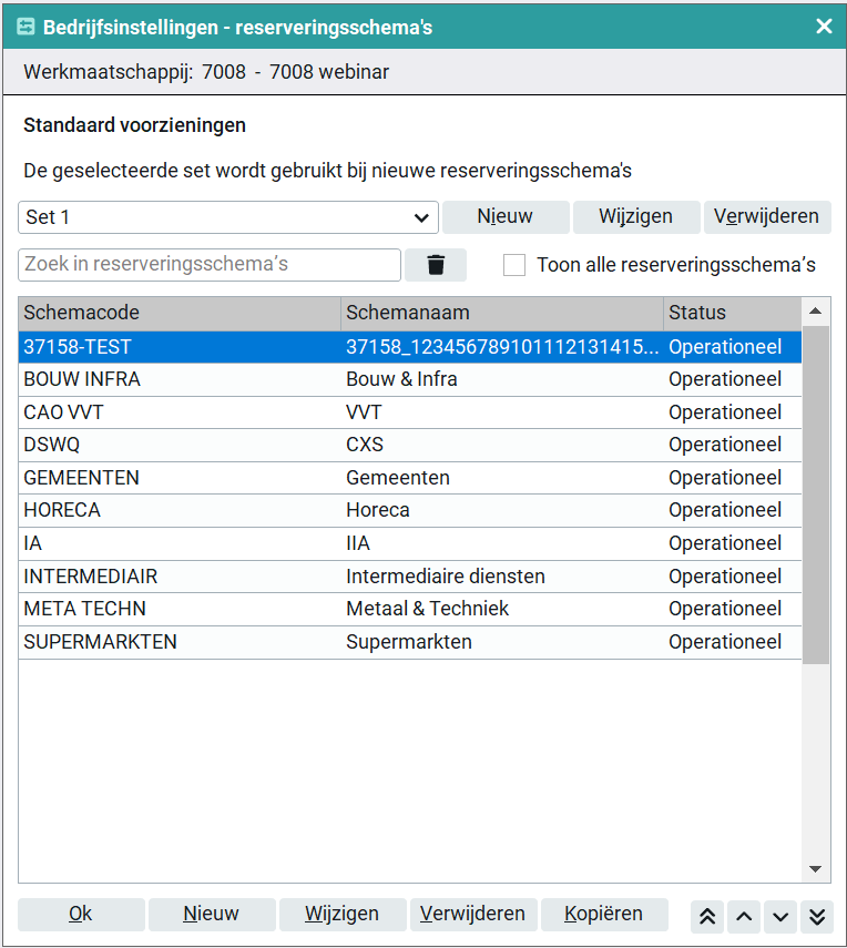 Op het scherm verschijnt een overzicht van alle operationele schema's. Door het activeren van de knoppen ‘Nieuw', ‘Wijzigen', 'Verwijderen' en 'Kopiëren’ kun je schema's toevoegen, wijzigen of verwijderen. Nieuwe of gewijzigde gegevens worden pas opgeslagen nadat de knop 'Opslaan' is geactiveerd. De knop 'Verwijderen’ is niet actief wanneer het schema dat je wilt verwijderen in gebruik is. Indien je een schema kopieert, worden alle gegevens uit de bron gekopieerd naar het doelreserveringsschema, inclusief afwijkend ingestelde reserveringen. Het is wel nodig om een nieuwe schemacode en schemanaam in te geven.