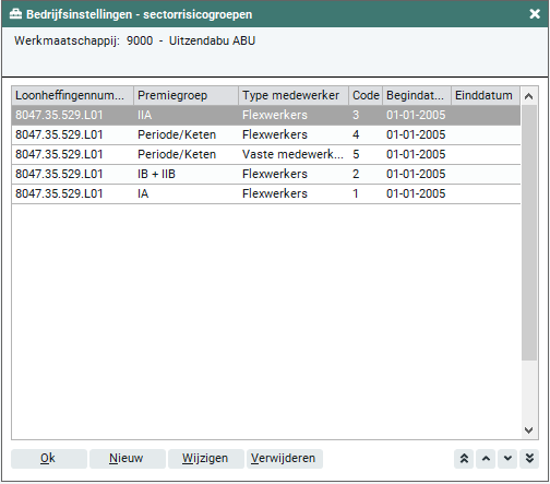 Op het scherm verschijnt een overzicht van alle vastgelegde sectorrisicogroepen. Door het activeren van de knoppen 'Nieuw', 'Wijzigen' en 'Verwijderen' kun je risicogroepen toevoegen, wijzigen of verwijderen. Nieuwe of gewijzigde gegevens worden pas opgeslagen nadat de knop 'Opslaan' door jou is geactiveerd. Indien je kiest voor het verwijderen van gegevens worden de te verwijderen gegevens eerst op het scherm getoond. Pas na het activeren van de knop 'Verwijderen' worden de gegevens daadwerkelijk verwijderd. Wanneer de risicogroep die je wilt verwijderen in gebruik is, bijvoorbeeld wanneer er in het tabblad 'Sectoren' verwezen wordt naar de risicogroep, is verwijderen niet mogelijk. De kolom 'code' toont een code die Easyflex zelf genereert. De code is een extra aanduiding om de sectorrisicogroepen en sectoren uit elkaar te houden.