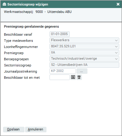 Wanneer je bij type medewerkers 'Vaste medewerkers' hebt geselecteerd, wordt de premiegroep automatisch gevuld met 'Periode/Keten' en kun je geen keuze maken. Ook wanneer je werkmaatschappij niet gekoppeld is aan sector 52, wordt de premiegroep automatisch gevuld met 'Periode/Keten' en kun je geen keuze maken. Wanneer er een sector aan de sectorrisicogroep is gekoppeld, is het wijzigen of verwijderen van de premiegroep niet meer mogelijk.
