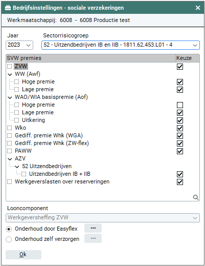 De gedifferentieerde premie Whk (WGA-flex) is het premiecomponent voor WGA-lasten van flexible dienstbetrekkingen. Voor de WGA-flex kun je nog geen eigenrisicodrager worden. Het premiepercentage voor de WGA-flex is per bedrijf verschillend en daarom niet standaard ingeregeld door Easyflex. Je dient deze premie zelf te onderhouden. Na het ingeven van het percentage wordt de mogelijkheid geboden de gegevens te kopiëren naar alle andere sectorrisicogroepen. De instelling of je eigenrisicodrager bent wordt niet overgenomen.