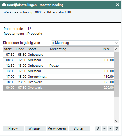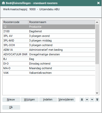 Op het scherm verschijnt een overzicht van alle vastgelegde roosters. Door het activeren van de knoppen 'Nieuw', 'Wijzigen', 'Indelen' en 'Verwijderen' kun je roosters toevoegen, wijzigen, indelen of verwijderen. Nieuwe, gewijzigde of ingedeelde gegevens worden pas opgeslagen nadat de knop 'Opslaan' door jou is geactiveerd. Indien je kiest voor het verwijderen van gegevens worden de te verwijderen gegevens eerst op het scherm getoond. Pas na het activeren van de knop 'Verwijderen' worden de gegevens daadwerkelijk verwijderd. Wanneer het rooster dat je wilt verwijderen in gebruik is, bijvoorbeeld wanneer het rooster in een uurloon- en/of tariefschema wordt aangeroepen, is verwijderen niet mogelijk.