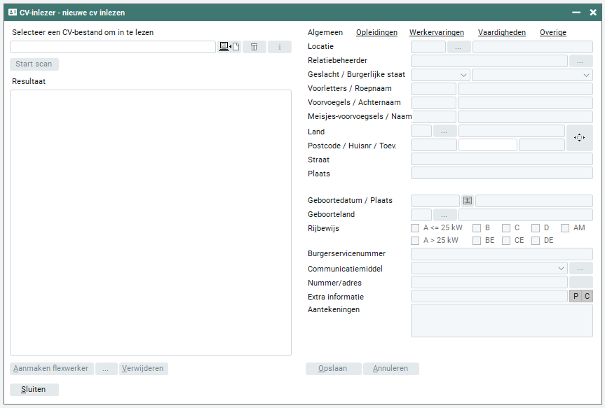 In het veld 'Resultaten' worden de resultaten na het inlezen getoond. Standaard worden de algemene gegevens van de flexwerker getoond. Je kunt nog doorklikken naar de overige tabbladen zoals: 'Opleidingen', 'Werkervaring' en 'Vaardigheden'. De wijze waarop de resultaten op deze tabbladen worden getoond, is de wijze waarop ze worden overgenomen in de diverse tabbladen bij de flexwerker zodra het CV wordt omgezet in een daadwerkelijke inschrijving. Met de knop 'I' kun je het originele CV inzien. Je kunt de gegevens van het ingelezen CV wijzigen.