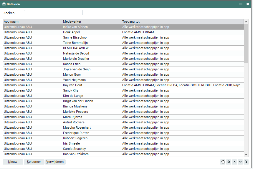Hier zijn de betreffende rechten te zien die zijn verleend aan de medewerker. Als er geen specifieke rechten zijn verleend, dan kan de medewerker alles werkmaatschappijen in de app zien.