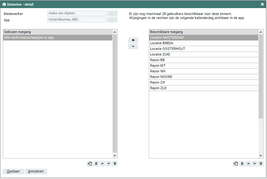 Hier zijn de rechten te selecteren om te verlenen aan de medewerker. Als er geen specifieke rechten tot locaties of rayons naar links zijn verplaatst, dan kan de medewerker alles zien van de werkmaatschappij(en).