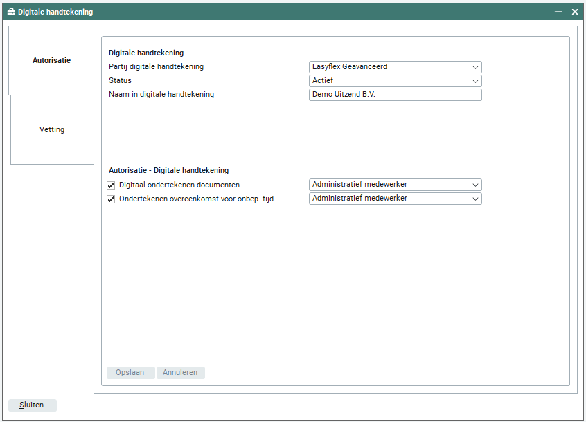 Vetting is het identificeren/controleren van personen. Voor het juridische proces dient Quo Vadis een lijst te ontvangen van de medewerkers die namens de werkmaatschappij de vetting mogen uitvoeren. In Easyflex is er geen autorisatie in te stellen en vindt er geen controle plaats of een medewerker op deze lijst voorkomt.