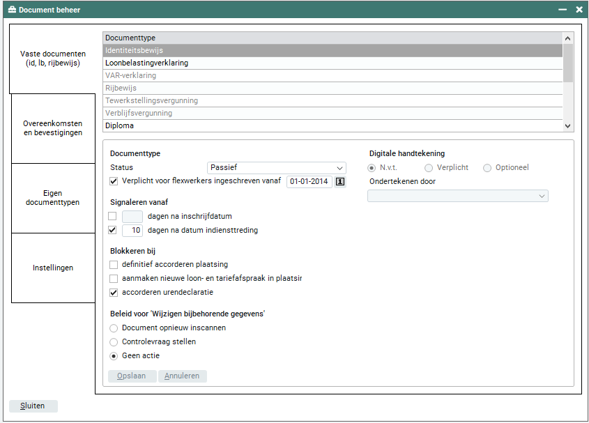 Bij de vaste documenten horen bepaalde gegevens. Denk hierbij aan de geldigheidsdatum van een paspoort of het nummer van een rijbewijs. Middels deze optie kun je instellen wat er dient te gebeuren wanneer je deze bijbehorende gegevens wijzigt.