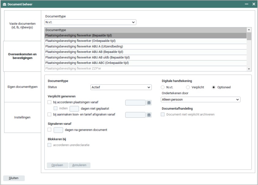 In dit tabblad kun je voor de documenttypen ‘Overeenkomsten’ en ‘(Plaatsings)Bevestigingen’ vastleggen of ze verplicht gegenereerd dienen te worden bij het accorderen van een plaatsing of bij het aanmaken van een nieuwe loon- en tariefafspraak. Verder is het mogelijk om een aanwezigheidscontrole vast te leggen, een signalering in te stellen én om het moment van blokkeren op te geven. Door een documenttype te selecteren kun je de bijbehorende gegevens wijzigen.