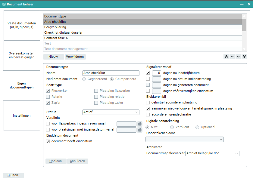 Let op! Wil je een document niet verplicht stellen voor alle flexwerkers maar wil je per flexwerker kunnen aangeven of de kopie van het document vereist aanwezig dient te zijn? Geef het documenttype dan de status ‘Actief’ maar zet geen vinkje bij ‘Verplicht’. Je kunt vervolgens bij de individuele flexwerker op het tabblad ‘Documenten > Vereist’ een vinkje zetten bij het betreffende documenttype.