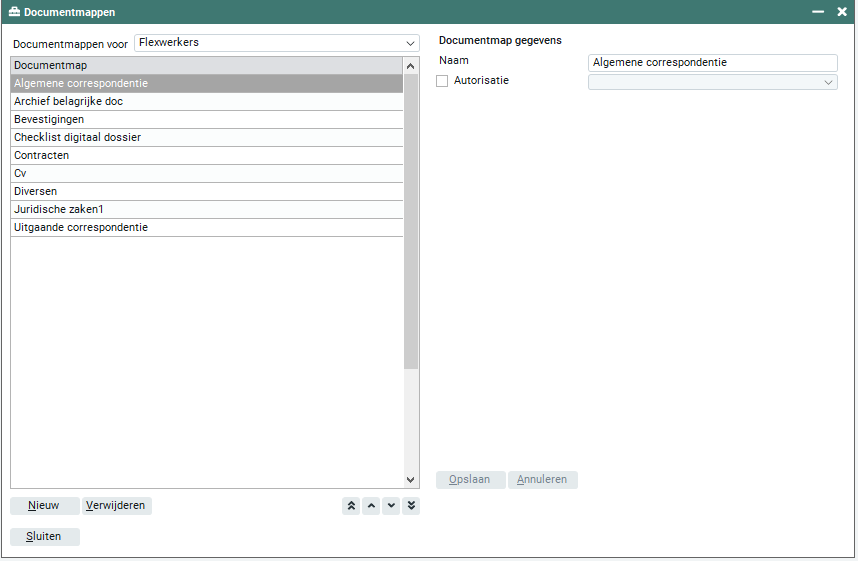 Op het scherm verschijnt een overzicht van alle vastgelegde documentmappen. Door het activeren van de knoppen 'Nieuw' en 'Verwijderen' kun je documentmappen toevoegen of verwijderen. Wanneer de documentmap welke je wilt verwijderen in gebruik is omdat er bij flexwerkers en/of relaties documenten onder zijn gearchiveerd, toont Easyflex je de volgende waarschuwing: 'Deze documentmap is in gebruik... Indien u deze map verwijdert worden alle documenten uit deze map verplaatst naar de algemene map. Wilt u deze documentmap verwijderen?' Wanneer je de documentmap wilt verwijderen terwijl deze nog gekoppeld is aan de archivering van een template, krijg je de volgende melding: 'Verwijderen is niet mogelijk omdat de documentmap in gebruik is voor het archiveren van templates…' Easyflex maakt standaard één documentmap aan, genaamd ‘Algemeen’. Deze documentmap kun je niet wijzigen of verwijderen.