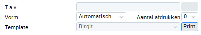 Wanneer er automatisch een document is geselecteerd kun je geen andere keuze maken, het veld is grijs. Wanneer de regel wit is kan er een keus gemaakt worden uit meerdere documenten vanuit 'Beheer > Document management > Templates'. Door het activeren van de knop 'Print' wordt het scherm 'Documentafhandeling' geopend waarmee je de definitieve opdracht kunt generen.