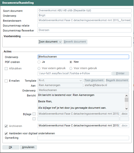 Op meerdere plaatsen binnen Easyflex kun je documenten afhandelen door deze af te drukken, te e-mailen, te archiveren of aan te bieden voor digitale ondertekening.