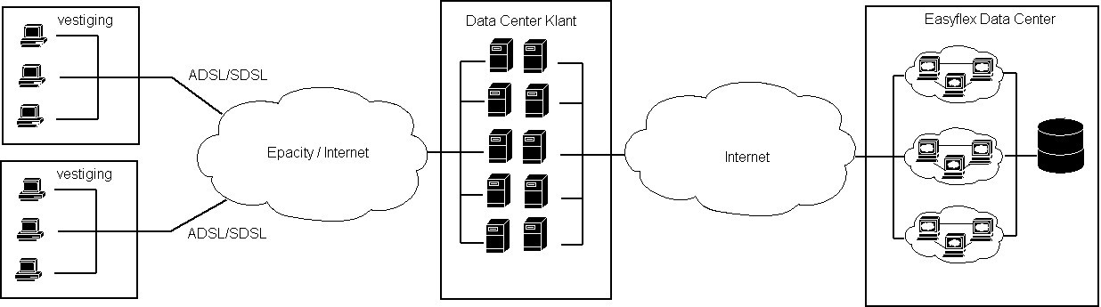 - De verantwoordelijkheid van de schaalbaarheid van Easyflex verplaatst zich van de Easyflex omgeving naar de Terminal Server omgeving van opdrachtgever. Een groei van het aantal eindgebruikers bij de opdrachtgever impliceert de groei van het aantal Terminal Servers. De ontsluiting naar het internet vanuit het datacenter van de opdrachtgever zal voldoende bandbreedte moeten bieden om een acceptabele performance voor iedere gebruiker te garanderen.