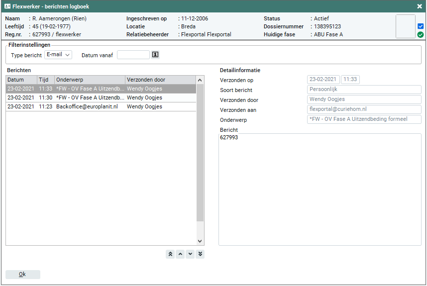 In dit veld worden alle SMS- of e-mailberichten getoond welke aan de flexwerker zijn verstuurd. Van de e-mailberichten worden alleen de e-mails getoond welke zijn verstuurd met behulp van een e-mail template