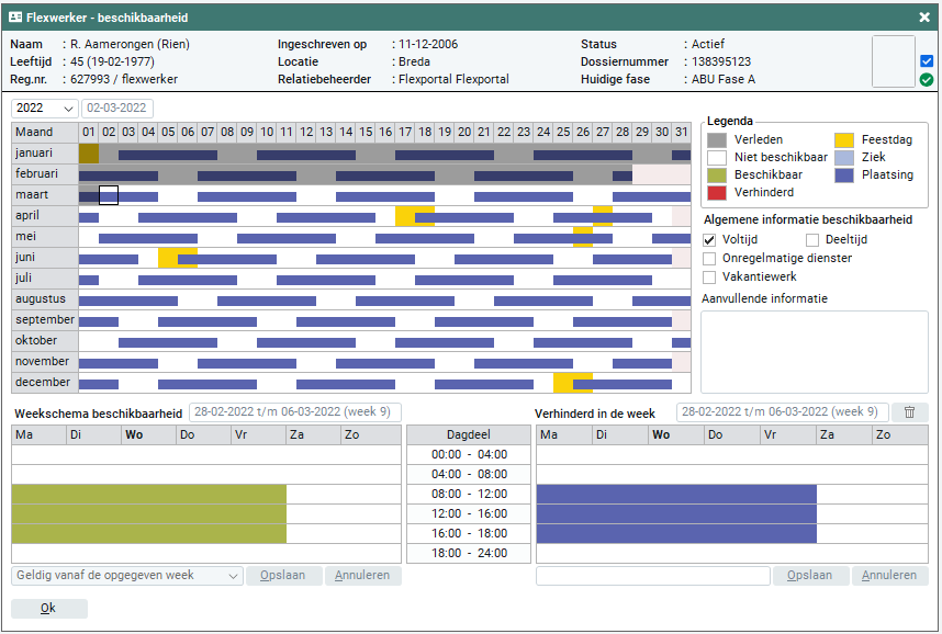 De beschikbaarheid wordt vastgelegd in een weekschema. Dit schema loopt altijd vanaf maandag tot en met de zondag en geldt tot een eventueel volgend vastgelegd weekschema. Ook kan de flexwerker aangeven wanneer en om welke reden hij verhinderd is. Deze verhindering wordt dan zichtbaar op het scherm. In een oogopslag kun je zien of een flexwerker al dan niet beschikbaar is. Het wijzigen van de instellingen is zeer eenvoudig.