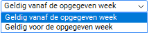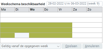 Je kunt nu ingeven of de beschikbaarheid geldig is vanaf de opgegeven week of alleen voor de opgegeven week. Wanneer je kiest voor 'Geldig vanaf de opgegeven week' wordt het beschikbaarheidsschema automatisch gekopieerd naar alle weken welke volgen op de ingegeven week bij 'Weekschema beschikbaarheid'. Wanneer je kiest voor 'Geldig voor de opgegeven week' wordt het schema alleen getoond in de week welke je hebt opgegeven bij 'Weekschema beschikbaarheid'.