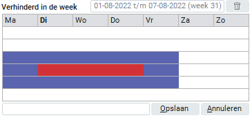 In het venster onder de week, kun je de reden van verhindering ingeven. Hiervoor dien je eerst de betreffende dag te selecteren. Dit kun je doen door boven in het schema 'Verhinderd' op de afkorting van de dag te klikken (Ma - Di- Za).
