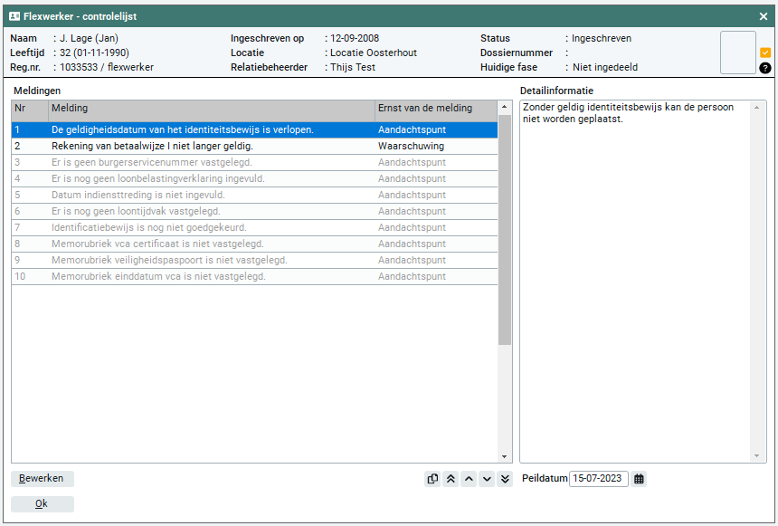 Wanneer er bepaalde zaken ontbreken bij de gegevens van de flexwerker, welke pas nodig zijn bij een arbeidsovereenkomst en/of plaatsing, worden deze gemeld als aandachtspunten. Welke gevolgen de probleemmelding heeft, wordt uitgelegd in de detailinformatie.