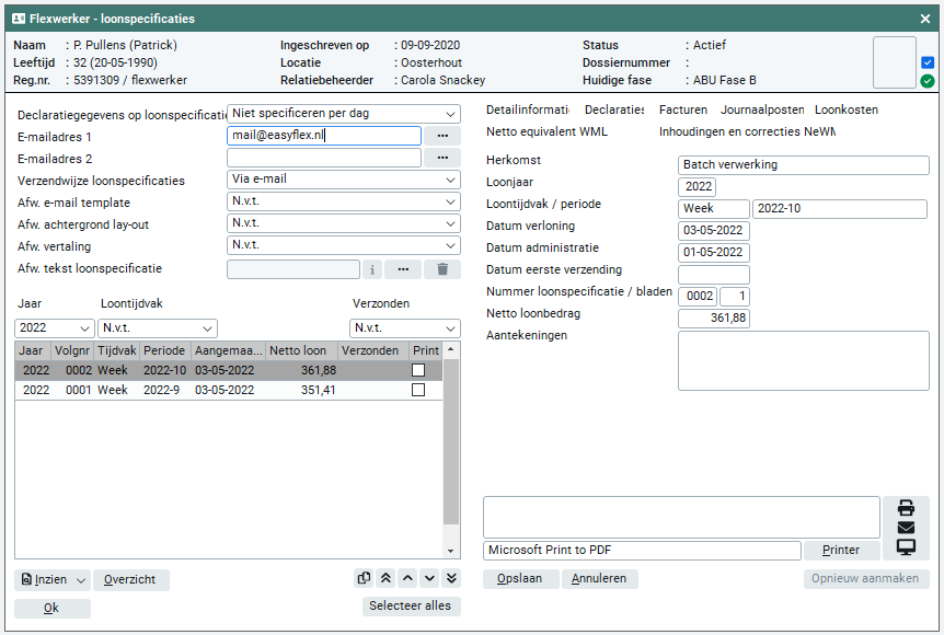 Het printen of e-mailen van een loonspecificatie geschiedt middels de standaard 'Documentafhandeling'. Wanneer je een loonspecificatie wilt e-mailen, wordt het e-mailadres geselecteerd dat bij 'E-mailadres' is ingegeven. Wanneer er geen e-mailadres is ingegeven, wordt het eerste e-mailadres geselecteerd dat bij de algemene communicatiemiddelen van de flexwerker is ingegeven. Wanneer er nergens een e-mail adres is ingegeven, kan je handmatig een e-mail adres ingeven. Je kan in alle gevallen het e-mail adres handmatig wijzigen.