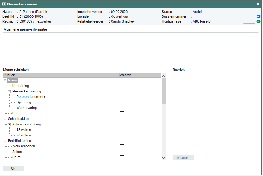 Wanneer je een memo-rubriek hebt aangemaakt (Beheer > Bedrijfsinstellingen > Ontwerp memobladen) kun je in dit veld tekst invoeren. Je kunt de inhoud van de tekst memovelden aanpassen met de knop 'Wijzigen'. Deze tekst wordt vervolgens als waarde van de rubriek getoond.